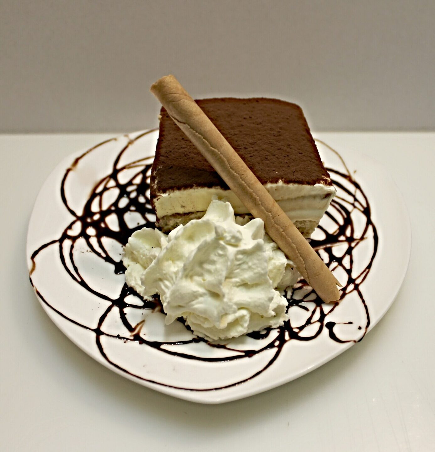 Huisgemaakt, origineel Italiaans gebak. Een combinatie van mascarpone, lange vingers, Amaretto met slagroom en cacaopoeder.